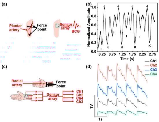 We set up a high-density sensor array which is compatible with multi-channel signal readout. Here we show a case study to collect and process human physiological signals. BCG is an indicator of human heart activity. As shown in Figure 6a, the weight of a person sitting still naturally exerts a certain pressure on the sole, which is mainly distributed on the heel and forefoot. The sparse distribution of the artery at the heel makes it difficult to detect week BCG signal. The plantar artery near the big toe is densely distributed. Therefore, the forefoot is the best position to place the pressure sensor for BCG recording.
