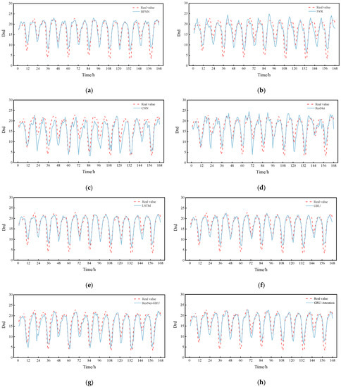 Comparison between RGA model and other models (a week). (a) BPNN; (b) SVR; (c) CNN; (d) ResNet; (e) LSTM; (f) GRU; (g) ResNet-GRU; (h) GRU-Attention; (i) RGA(ours).