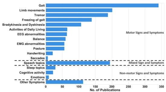 Wearable and mobile technology can help medical practitioners assess the progression of PD patients by tracking their symptoms. These symptoms, referred to as cardinal PD features, are divided into motor symptoms and non-motor symptoms, as shown in Table 1. The motor symptoms are the movement impairments due to PD. They have traditionally been associated with tremor, rigidity, bradykinesia, and postural instability. Additionally, abnormalities in limb movements, such as hand rotation, finger tapping, and arm angle, have been regarded as motor symptoms. In contrast, non-motor symptoms include a large variety of cardinal features, such as sleep disturbance, cognitive activity, fatigue, dementia, and psychiatric impairments, as listed in the second column of Table 1. Finally, mixed symptoms, such as speech and swallowing difficulties, involve a combination of motor and non-motor activities. To show the prominence of these symptoms and justify their inclusion in our analysis, Figure 1 shows the number of articles that measure the different motor and non-motor symptoms. Gait abnormalities, including FoG, are the most common symptoms measured, followed by tremor. Movement problems, such as bradykinesia and dyskinesia, are also common symptoms in PD patients. Many research articles use modern measurement techniques to monitor these symptoms.