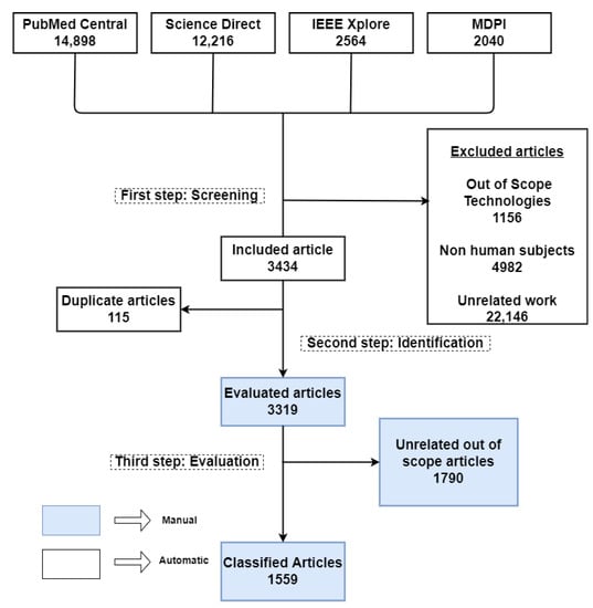 As part of the manual classification, we also exclude articles that fell out of the scope of our review. For example, despite falling outside this scope, some articles use specific terms, such as “sensor” and “acceleration”, which initially led them to be included in our review, hence the need for manual classification. Similarly, the script accidentally included some articles because they featured the term “ECG”, which in these cases, was related not to PD but “Wolff–Parkinson–White (WPW) syndrome”. We manually excluded such articles from the final list of classified items. Overall, we identified that 1559 of the 31,718 articles were relevant and classified according to their technology and application areas.