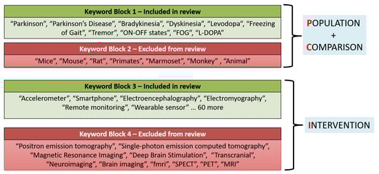 We developed an automated script in Python to filter the information collected from the four databases. Following the PICO strategy [], our script uses four keyword blocks adapted from [] to implement the selection and exclusion criteria. The first keyword block, which has 10 PD-related keywords, specifies the inclusion criteria in terms of the PD terminology and symptoms. After selecting the articles with at least one of these keywords in TAK, the second block, which has 7 keywords, was used to exclude the studies conducted on non-human subjects, as shown by the first two blocks in Figure 3. Next, we filtered the articles according to the type of device discussed with the next set of keyword blocks. Specifically, the third keyword block has 66 terms for 66 technology devices commonly used for PD assessment. This block is illustrated by the third block in Figure 3, while the complete list of keywords is provided in Appendix C. Finally, we used the fourth keyword block, which consists of 11 terms, to exclude 11 technologies that are currently unsuitable for use outside the four walls of an actual clinic. Five such technologies are MRIs, deep brain simulation, PET, neuroimaging, and SPECT. A complete list of all keywords is provided in Appendix C.
