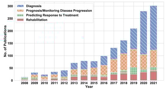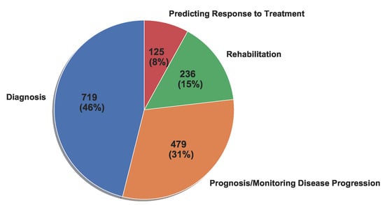 Wearable technology has varying levels of utility in each application area of PD, as the pie chart in Figure 5 shows. Of the 1559 articles evaluated, 719 (46%) focus on PD diagnosis (including diagnostic assistance) and 479 (31%) focus on PD prognosis and monitoring. Furthermore, 236 articles (15%) address patient rehabilitation and patient QoL, and 125 articles (8%) analyze the effects of medicine and other treatments on patient symptoms. Figure 5 shows that the most frequently targeted application areas during 2008–2021 are diagnosis and prognosis/monitoring disease progression. The following sections detail the trends in each application area.