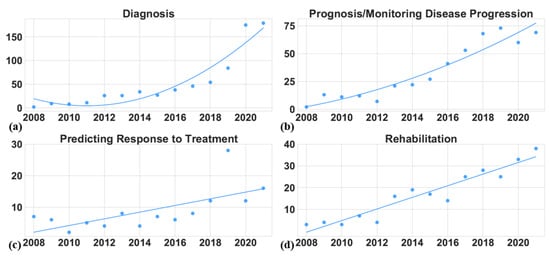 The number of research publications (2008–2021) divided by PD application area: (a) publications about diagnosis, (b) publications about prognosis and monitoring, (c) publications about predicting patient responses to treatments, and (d) publications about rehabilitation.