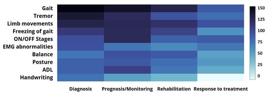 Our review and previous surveys of the PD literature [,] show that monitoring motor and non-motor symptoms can be helpful in four primary application areas in the PD research context: diagnosis, prognosis and monitoring, predicting response to treatment, and rehabilitation. The rest of this section reviews these areas.