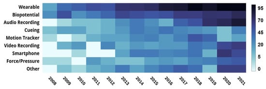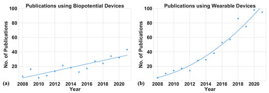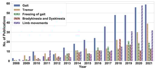 Advances in sensing and processing technologies facilitate the long-term objective measurement of symptoms. Hence, new sensors, wearable devices, video capture/processing systems, and mobile technologies enable a wide range of monitoring, diagnosis, and rehabilitation applications [,,,,,,,,,,]. Indeed, the number of publications that report using wearable and mobile technology for PD research increased by more than 20-fold from 2008 to 2021, as discussed in Section 4. Popular devices include inertial measurement units (IMUs), force and pressure plates, biopotential sensors, and optical motion capturing systems. This paper analyzes the trends of technology use in the PD context by analyzing articles published between 1 January 2008, and 31 December 2021. Starting with the keyword “Parkinson”, we performed an electronic database search in PubMed Central, Science Direct, IEEE Xplore, and MDPI to retrieve all articles related to PD. This search yielded 31,718 articles after we removed surveys and articles written in a language other than English. After completing the keyword-based automatic filtering of articles, we inspected the articles and classified them manually so that we could better understand their relevance to (1) application areas of the proposed solution, (2) symptoms measured for the application, and (3) devices and sensors used for measuring the symptoms. Then, we reviewed each article by performing four steps: