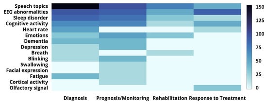 Being well aware that a correct diagnosis is of prime importance, many researchers have proposed objective and inexpensive technology-based PD diagnostic techniques. Figure 6a shows that the number of articles on PD diagnosis increased steeply and surpassed 150 in the last two years. A more detailed investigation indicates that studies analyzing both motor and non-motor symptoms contributed to this increase. For example, Raethjen et al. [] and Zhang et al. [] used EEG and EMG data to characterize tremor in PD patients. Similarly, gait analysis using smartphone accelerometers successfully distinguished PD patients with gait disorder from healthy controls []. Muscle-activity information obtained from EMG sensors has also proved helpful in PD diagnosis. For example, Meigal et al. [] employed surface EMG (sEMG) to distinguish between PD subjects and healthy controls and analyzed the severity of the former subjects’ symptoms. Studies focusing on non-motor symptoms analyzed sleep patterns and speech disorders as PD biomarkers. With EMG data recorded from the chin of a sleeping PD patient, researchers conducted a comparison between the rapid eye movement (REM) of PD patients with REM sleep behavior disorder (RBD) and PD patients without RBD []. Similarly, Campos-Roca et al. extracted various acoustic features from an acoustic data set of 40 healthy control and 40 PD patients []. In another study, Tsanas et al. used four parsimonious subsets of 132 dysphonia features from an existing data set of 263 samples drawn from 43 subjects []. The authors showed that the classification with the new dysphonia features reached almost 99% accuracy. These studies show that recent technological advances combined with novel algorithms can help clinicians develop objective measures for PD diagnosis. Table A4 in Appendix B provides a comprehensive list of the articles focusing on diagnosis.