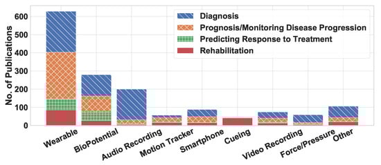 Existing surveys focus on the technical contents of each proposed approach in the literature. They typically summarize the contributions, strengths, and weaknesses of particular methods [,,]. In contrast, our analysis takes a holistic view to analyze macroscopic research trends. Hence, it can help researchers understand the current trends and identify the gaps in the literature. To our knowledge, this article presents the first systematic study that analyzes the research trends in wearable and mobile usage for PD. Our results summarize the use of wearable and mobile in terms of application areas, types of devices, and their recent trends.