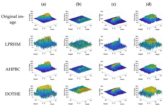 LSBR: In this metric, AHPBC, DOTHE, CLAHE, and HE all appear lower than the original image. The proposed method and the LPRHM performed better. The LPRHM algorithm has the best metric performance, but the proposed method is slightly inferior to the LPRHM algorithm. As shown in Figure 17, this paper selects the target area to draw the grayscale image of all the methods. All five contrast methods generate noise in the background, with the LPRHM method having the most severe point noise. These point noises are considered dim targets and improve the value of LSBR. The point noise weakens the detectability of the target. In the proposed method, the gray value of the target area is improved, and the background noise around the target is also suppressed, which shows that the detection effect of the target in this method is the best.