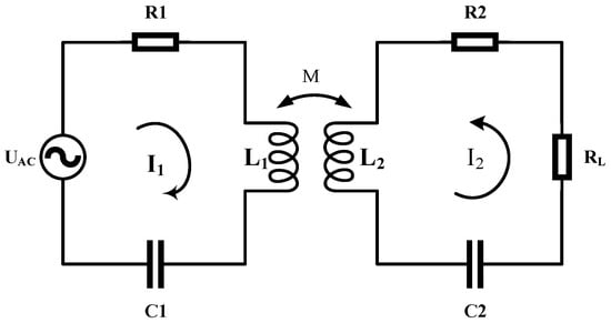 AC is the AC power supply. R1 is the sum of the internal resistance of the AC power supply, the radiation resistance of the transmitting coil, and the ohmic loss resistance. C1 and C2 are the compensation capacitors of the transmitter and receiver, respectively. L1 and L2 are the transmitters. RL is the load resistance of the receiving end. I1 and I2 are the total currents of the two loops. According to Kirchhoff’s voltage (KVL) law, the equilibrium Equation (2) is obtained.