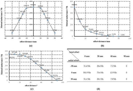 Mutual inductance changes when the coil offsets: (a) effect of radial offset on mutual inductance; (b) influence of axial offset on mutual inductance; (c) influence of angle offset on mutual inductance; (d) simultasneous radial and axial offset changes in mutual inductance.