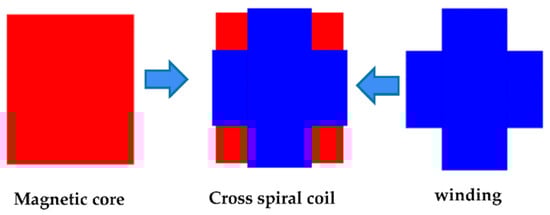The magnetic field of the cross spiral coil is uniformly distributed along a diagonal line of the square magnetic core and the magnetic field strength is larger than in other areas based on the above characteristics. A new coupling structure in which four cross coils are superimposed on a plane is designed, as shown in Figure 7.