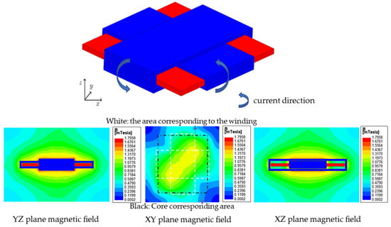 From the above Figure 6, the magnetic field distribution is symmetrical and relatively uniform on the XZ and YZ planes, while the magnetic field distribution on the XY plane is only symmetrical about the extension of the core diagonal. According to Faraday’s law of electromagnetic induction and the right-hand spiral law, in the corner area where the magnetic field distribution is the smallest in Figure 6, the magnetic fields generated by the two rectangular coils are almost opposite in direction and cancel each other out.