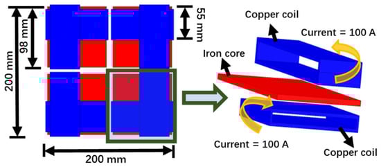 The cross helical coil structure is a mutually superimposed enhancement area, while the magnetic field intensity on the other diagonal is relatively small. The uniformity and symmetry of the magnetic field generated by the overall coil are not enough. The new coil moves the coil originally located in the center to the outside of the magnetic core, retains the diagonally enhanced area of the original cross coil, removes the area with the weak magnetic field, and obtains a larger magnetic field enhancement range. Four identical coils and four corners are placed symmetrically about the center to make the magnetic field center-symmetrical. Finally, the quadrilateral overlapping coupled coil structure is obtained, and the current flow direction, plane magnetic field distribution, and coupling mode on each coil section are shown in Figure 9.