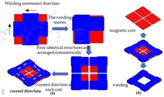 Derivation of the new coil structure: (a) coil structure derivation and current direction; (b) coil structure composition.