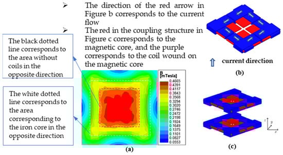 Magnetic field distribution, current flow, and coupling method: (a) XY plane magnetic field distribution; (b) XY plane magnetic field distribution; (c) schematic diagram of coupling structure space.