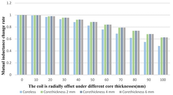 As shown in Figure 11, when the coil is offset by 100 mm, the mutual inductance of the structure with a magnetic core can be maintained at about 62%, while the mutual inductance of the structure without a magnetic core is reduced to 48.2% at the beginning. With the change of the coil offset distance, the change rate of the mutual inductance of the coil without iron core is larger than that of other coils with iron core. The variation of mutual inductance obtained by iron cores with different thicknesses is basically the same.