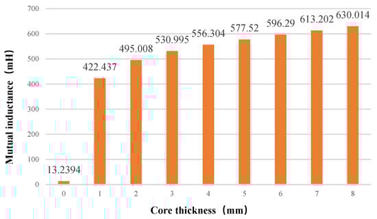 As shown in Figure 12, the larger the core thickness value, the greater the positive mutual inductance. The mutual inductance coefficient obtained by the coreless simulation is 13.2394 MH, and when the iron core thickness is 8 mm, the mutual inductance coefficient reaches 630.014 MH. It is concluded that the iron core in the coil is an indispensable part. Its existence is beneficial to the anti-offset performance of the coil, but the thickness of the iron core has little effect on the performance, and thereby the thickness of the coil can be flexibly adjusted according to the actual situation.