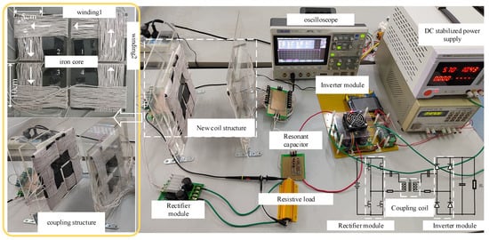 To test the characteristics of the anti-offset capability of the new quadrilateral overlapping wireless energy transmission coupling coil structure, a wireless energy transmission system platform, as shown in Figure 13, was built.
