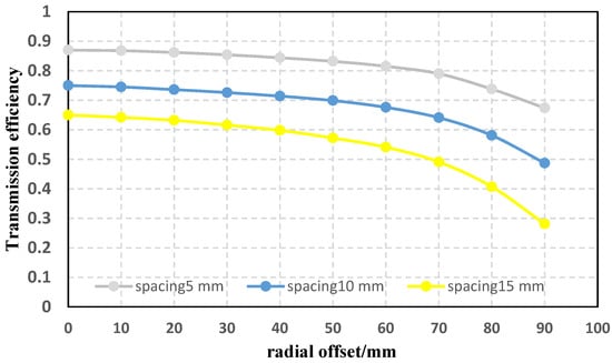 It can be seen from Figure 4 that the mutual inductance is the largest when the coil is displaced in the radial direction. The mutual inductance coefficient gradually decreases when migrating toward both sides, and the mutual inductance coefficient decays slowly at the beginning. When offset along the axial direction, the mutual inductance coefficient between coils decreases with the increase of offset distance, and the attenuation amplitude is the largest in the initial stage. Therefore, the coil needs to be kept in the right direction and at an appropriate distance, which promises systems have a high transmission efficiency and the influence of a small axial offset is much greater than that of the radial direction.