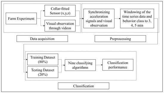 The flow of the methodology in evaluating the collar-fitted accelerometer sensor as shown in Figure 1 consists of data acquisition, data preprocessing, and data classification. The sub-steps of each major method were discussed further in the succeeding sections of the study.