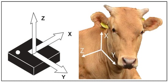 Orientation of the sensor in the Korean steer. The left figure showed the directions of the detectable accelerations on top view. The figure on the right shows the directions of the detectable accelerations when the sensor is positioned on the right neck side of the cattle. The x-axis measured the vertical movements of the head of the cattle, the y-axis measured the horizontal movements of the head of the cattle, and the z-axis measured the lateral, sideways, or rotational movements of the head of the cattle.
