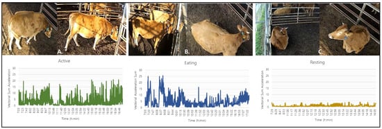 The three major cattle behaviors studied were (A) active behavior (standing and walking motions), (B) eating behavior (feeding, ruminating, and drinking motions), and (C) resting behavior (sleeping and lying motions). Below each behavior were the graphs of the vectorial sum acceleration per minute of the three major cattle behaviors.