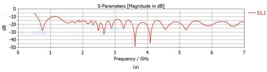 Two different antenna configurations, namely hyperthermia applicators, were used in this work: linear and circular. Antipodal Vivaldi antennas, whose frequency range is given in Figure 1a, were used as sources. A 2.45 GHz operation frequency was chosen as it is one of the ISM bands. Figure 1b shows the linear antenna system (linear applicator), where 6 antennas are placed linearly 2 cm apart on one side of the breast and the remaining 6 antennas are placed on the opposite side of the breast. Although there are 12 antennas, we treated 3 successive antennas as an array with same excitation, and excitations took place for 4 antenna arrays. Consequently, 4 phase and 4 amplitude variables were defined. Please see [] for a detailed explanation of the antenna configuration and the excitation scheme. Among the 4 phase variables, one of them should be defined as a reference, , in order to obtain a unique phase set. From the remaining phase variables, two of them were given a solution space of and, finally, the 4th phase variable was defined as a function of the previous two phase variables, .
