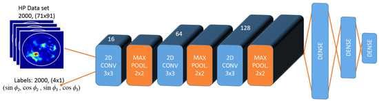 Data sets for each simulation case were built using (2). The central slice of the breast was utilized; that is, a data set composed from 2D data. First, only phase optimization was considered, in which, the antenna excitation voltages were equal. For the linear system, 2000 distributions were produced with unitary excitations using integer phase pairs that were randomly chosen. Electric fields were then converted to HP distributions using (3). HPs were normalized such that the highest energy level was 1 and lowest energy level was 0. Produced HP data were labeled with the corresponding phase pairs. Note that, instead of using the phase values directly, sine and cosine of the phase were utilized for robustness. As can bee seen in Figure 2, these HP data with size 71 × 91, along with the labels, were used for training the CNN-1, where CNN-1 is the first step of the CNN model fed with the data set, in which, only the phase of the antennas change. CNNs were modeled on Jupyter Notebook using Python’s Keras and TensorFlow modules on an Intel Xeon CPU with 3.10 GHz.