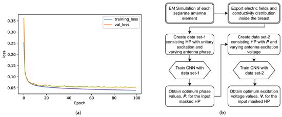 The same structure was used for CNN-1 and CNN-2 models. Only difference was the output size of the last dense layer: for linear applicator data set, output size was 4, whereas, for the circular applicator data set, output size was 12. CNNs were trained successfully using the generated data sets. An example of training and validation loss graphic for CNN-2—that is, for circular system voltage level optimization with increasing epoch—is given in Figure 3a. The flowchart for excitation optimization approach is given in Figure 3b.