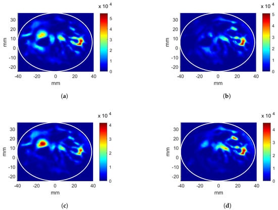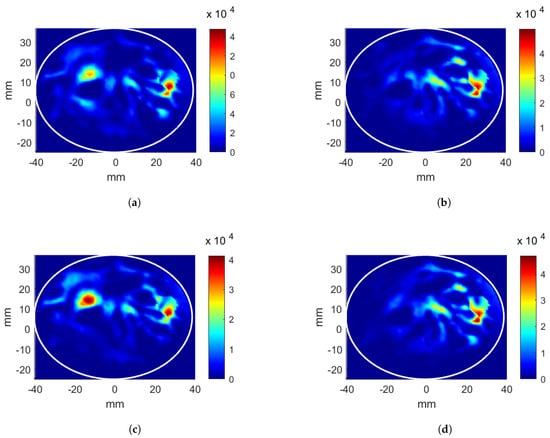 Four cases of applicator and breast were studied: (i) linear applicator and breast without tumor, (ii) linear applicator and breast with tumor, (iii) circular applicator and breast without tumor, and (iv) circular applicator and breast with tumor. During simulations with tumor, a sphere with 5 mm radius was placed on the central slice of the breast phantom. Tumor inclusion had and S/m, which is very close to the maximum electrical conductivity level in the breast []. Note that, in the cases (ii) and (iv), it was assumed that the patient was diagnosed with cancer, and that the tumor location, as well as the breast dielectric properties distributions, were known.