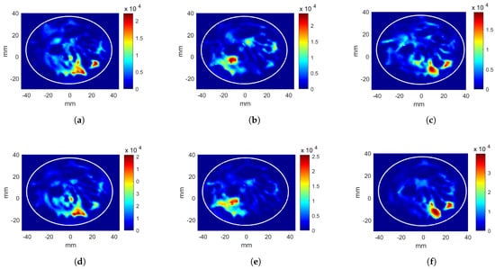 Heating potential distributions (Wm) for circular antenna system with excitation parameters obtained from CNN. Phase-only optimization of (a) breast without a tumor, target at mm position, (b) breast without a tumor, target at mm position, and (c) breast with a tumor at mm position. Phase and power optimization of (d) breast without a tumor, target at mm position, (e) breast without a tumor, target at mm positionm and (f) breast with a tumor at mm position.