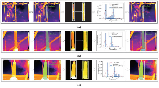 Figure 8 shows the process of the normal bushing infrared image detection. In the fourth column, the temperature probability density distribution of the bushing has only two local maxima, which reflects that the substation equipment is no defect. This demonstrates that the TDDM is effectively applied in detecting normal substation equipment.