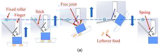 Two-hand design plans for tilting the tableware were built to throw away the leftover food. The fingers opening and closing are similar to the two types of hands. Two fingers are attached to the linear guide and connected to the timing belt so that they can open and close simultaneously. The timing belt is driven by an air cylinder to control the opening and closing of two fingers at the same time. Sponges are attached to the fingers so that the tableware can easily grasped with a larger frictional force []. The main difference is the design of the parts to throw away leftover food, illustrated in Figure 3. In type 1, a rotation axis in the direction of the air cylinder is provided in the middle of the finger so that half of the fingertip can rotate. A stick is attached to the rotating part, hooked on a roller fixed to the frame, and the arm raised the hand to rotate it. In addition, a spring is attached to the rotating fingertip to return it to its original position. In type 2, the T-shaped bearing is rotated 90 degrees and connected to the arm. Two rods are attached to the board of the hand, and by hitting the fixed roller, the tableware grabbed by the hands is tilted, and the leftover food is thrown away. The designed mechanism that rotates the tableware without using a motor could reduce the weight and cost of the hand [].