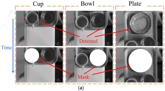 Although this study aimed to detect overlapping tableware, the Hough circle transform cannot detect all tableware very well when the tableware overlaps [], and the tableware that is not detected cannot be processed by the robot. To solve this, a dedicated detection for certain tableware was developed, as shown in Figure 5. Each image limits the radius, which guarantees that only specific tableware can be detected. Thus, even if the tableware overlaps, it can be detected. After tableware detection, the part of the tableware surrounded by the red dotted line, as shown in the figure, is removed, and pattern- matching with the model image was performed. If the degree of similarity is less than or equal to the threshold value, it is regarded as an erroneous test and excluded. It is recognized as the correct tableware position if it is beyond the threshold value. Then, a mask is attached to the detected position.