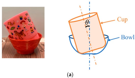 When the cup overlapped with the bowl, the bottom of the bowl was narrow and the cup could have tilted. In order to investigate the relationship between the tilt angle of the cup and the detection rate, the tilt angle was changed by 10 degrees from 0 to 50 degrees, as shown in Figure 13a, and the results are summarized in Figure 13b. For the cup, it could not be detected when the angle exceeded 30 degrees. The reason is that the edge of the cup looks elliptical as the angle increases in the image, making it undetectable. For the bowl, when it was larger than 30 degrees, it became almost undetectable. The reason was that the cup tilted at a certain angle and hid a part of the bowl that made the bowl not be detected. To solve it, the method that detected an ellipse was considered.
