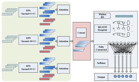 As shown in Figure 1, multi-scale and multi-level information is first extracted using the multi-scale feature extraction module, followed by spatial and channel weight correction. The obtained features are Concat fused. Subsequently, the features are flattened using a Flatten layer and imported into the BiLSTM after batch normalization to extract the temporal dependencies of the features. Up to this point, the model has extracted the spatial and temporal dependencies in the original signal. In the end, the classification is achieved using the fully connected layer and the SoftMax function. Focal Loss is used for the loss function to ameliorate the problem of the difficult classification of small samples due to data imbalance, and the final classification results are obtained. The BiLSTM uses 128 units, and the numbers of fully connected layers are 48 and 11, respectively. To enhance the robustness of the model, a DropOut layer with a random drop rate of 0.2 is used after the BiLSTM layer for processing.