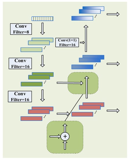 As shown in Figure 2, to achieve multi-scale feature extraction, three convolution kernels with convolution kernel sizes of 1 × 1, 5 × 1, and 10 × 1 are used to perform three layers of convolution, respectively. Considering the small input, the numbers of convolution kernels in each layer are 8, 16, and 16, respectively. In order to realize multi-level information fusion, referring to the FPN network, the features obtained after the third convolutional layer and the features after the second convolutional layer are added element by element, and the features of the second layer are supplemented and enhanced. Then, a convolutional layer with 16 channels and a size of 1 × 1 is used to process the features obtained after the first convolutional layer, so that the number of channels is the same as that of the enhanced second layer feature channels, and then perform element-by-element addition. The enhanced first-layer features are obtained to realize the fusion of multi-level information and make full use of the multi-level features. The features extracted by each convolutional layer are passed through the batch normalization layer and the pooling layer, which improves the calculation speed, reduces the size of the feature, improves the stability and robustness of the model, and uses the activation function to improve the model expression ability.