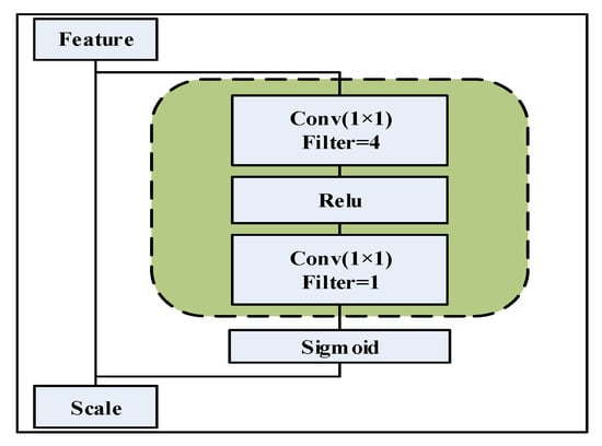 MSA first uses a convolution kernel with four channels and a size of 1 × 1 to compress and fuse the features adaptively and then uses a 1 × 1 convolution kernel to learn the importance of the position in the space. The significance is quantified to obtain the weight distribution of the feature in space. Finally, adaptive correction is performed according to the importance of features, meaning that the model pays more attention to those features that have a great influence on the classification results and suppresses those features that have less influence on the classification results. The specific implementation method is as follows: