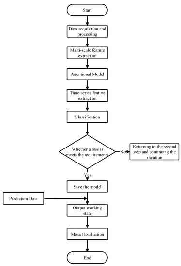 Then, the MsCNN–BiLSTM model is established according to Figure 1. The model first extracts the multi-scale spatial features of input using MsCNN and adaptively adjusts the features using the attention model. Then, the multi-scale features processed by the attention model are introduced into the BiLSTM to obtain the temporal dependencies. Finally, the fully connected layer and SoftMax classifier are used for classification. During the training process, when the model classification loss meets the requirements or the number of iterations is reached, the training is finished, and the current model is saved. Finally, the test data are imported into the trained model, and the conditions identified by the model are output. The model is evaluated using evaluation metrics such as accuracy and recall, verifying the performance of the model.