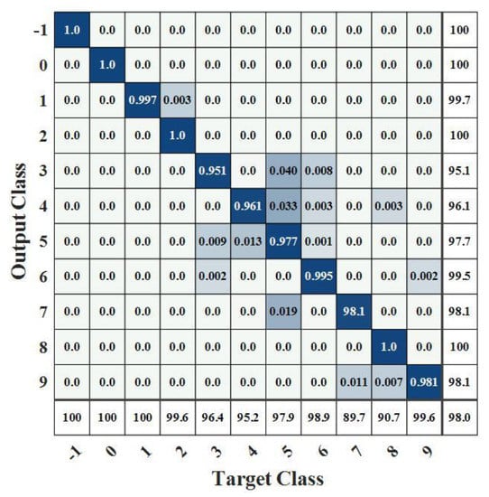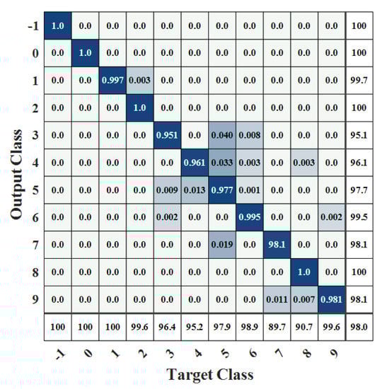 Figure 6 and Figure 7 show the confusion matrix obtained after model identification. The darker part indicates a greater proportion of the sample. Samples on the diagonal in the matrix indicate the proportion of that sample that is accurately classified. The rightmost side indicates accuracy, and the lower side indicates recall. The correspondence between labels and work conditions is shown in Table 4.