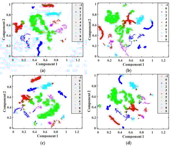 Visualization of the output feature T-SNE reduction: (a) the proposed model; (b) BP–ANN; (c) CNN; (d) BiLSTM.