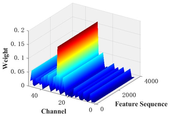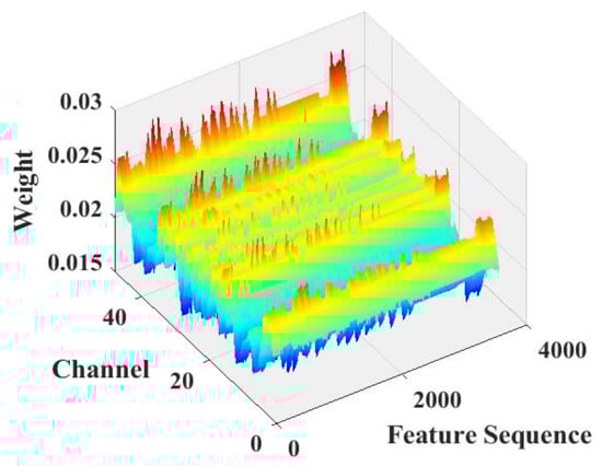 Figure 12 shows the distribution of the attention weights output by the SoftMax function using the proposed attention model when the model is only 83.2% accurate. It can be seen that the model focuses a large amount of attention on one channel, which is much larger than the weights assigned to the other channels, indicating that the model ignores a large number of features on the other channels, thus resulting in an extremely low final classification accuracy.