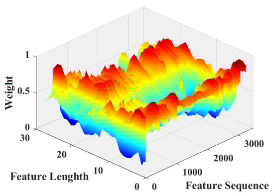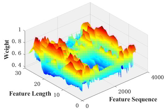 Figure 10 shows the weights of the different spatial locations when computing the channel attention and performing the global adaptive weighted average pooling. The figure shows that when performing the adaptive weighted average pooling of compressed features, features at different locations within the same channel are not simply summed and re-averaged but are weighted and averaged according to the contribution of the spatial features to the classification result. The features obtained after adaptive weighted averaging pooling contain more information when used to quantify attention weights, thus optimizing the feature compression strategy.