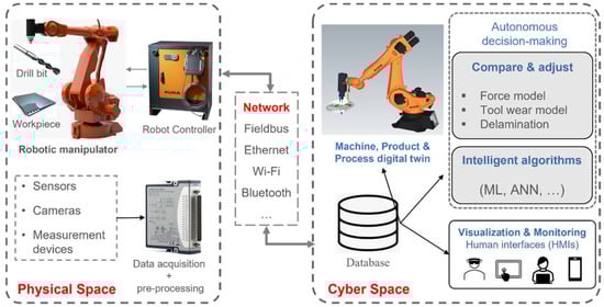 In this section, the general architecture for robotic drilling (machining) using a digital twin is introduced (see Figure 1). Information that is collected from the physical space is used for monitoring, control, optimisation and autonomous decision making []. There are three main elements in the digital twin: 1. Physical space, 2. Cyber space and 3. Communication network.