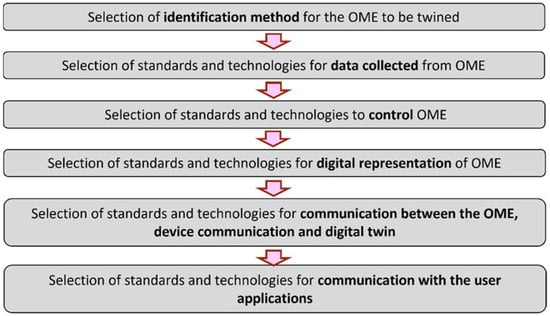 The requirements of a digital twin for manufacturing include accuracy, communication, data acquisition, data analysis, data integrity, extensibility, granularity, identification, management, product life cycle, security, simulation, synchronization, viewpoint and hierarchical modelling of digital twin for manufacturing []. To apply this framework to a manufacturing operation, different standards and technologies are used in the different steps, as outlined in Figure 3.