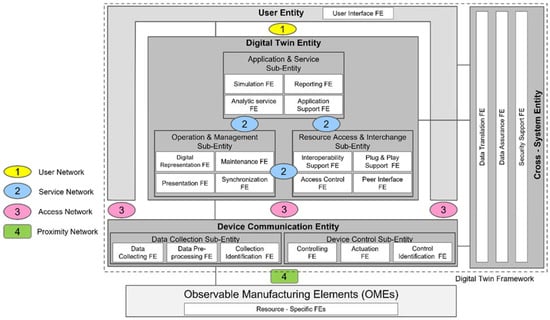 Functional view of entity based digital twin reference architecture combined with Network view. Adapted from [,]. OME = observable manufacturing element; FE = functional entity.