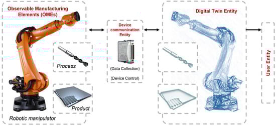 Figure 5 presents a schematic diagram of the digital twin framework for robotic drilling based on ISO 23247. The digital twin entity shown on the right of Figure 5 is used as the digital representation of the physical OMEs, shown on the left of Figure 5, including the robotic manipulator, the drilling process and the product.