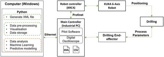The main objective of the experiment is to demonstrate real-time visualisation of the drilling feed and rotation torque as a first step in digital twinning. Figure 7 demonstrates the process flow for executing the drilling process using an industrial robot and real-time visualisation of the process parameters. The main controller (Industrial PC) is connected directly to the drilling end-effector and the robot controller. During drilling, the digital oscilloscope located in the main controller, displays real-time sensor data at a sample rate of 250 Hz. An external Windows laptop is connected to the main controller via Ethernet cable to allow real-time data communication. Prior to the drilling operation, an XML (Extensible Markup Language) file is generated via Python (Windows laptop), which includes the reference and drilling points, the robot trajectory and the drilling process parameters. This XML file is then uploaded to the pilot software (V7000 in the industrial PC) to perform the drilling process.