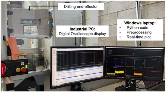Figure 8 shows the equipment for data collection and visualization of the robotic drilling process. From the figure, the drilling end-effector is executing the drilling operation, the industrial PC (digital oscilloscope) extracts the data from sensors embedded in the end-effector and the Windows laptop demonstrates the real-time drilling process parameters.