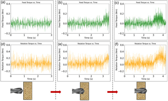 Real-time data plots of feed torque (a–c) and rotation torque (d–f) in different drilling steps extracted from servo motors located in the end-effector causing drilling feed and rotation motion, respectively.